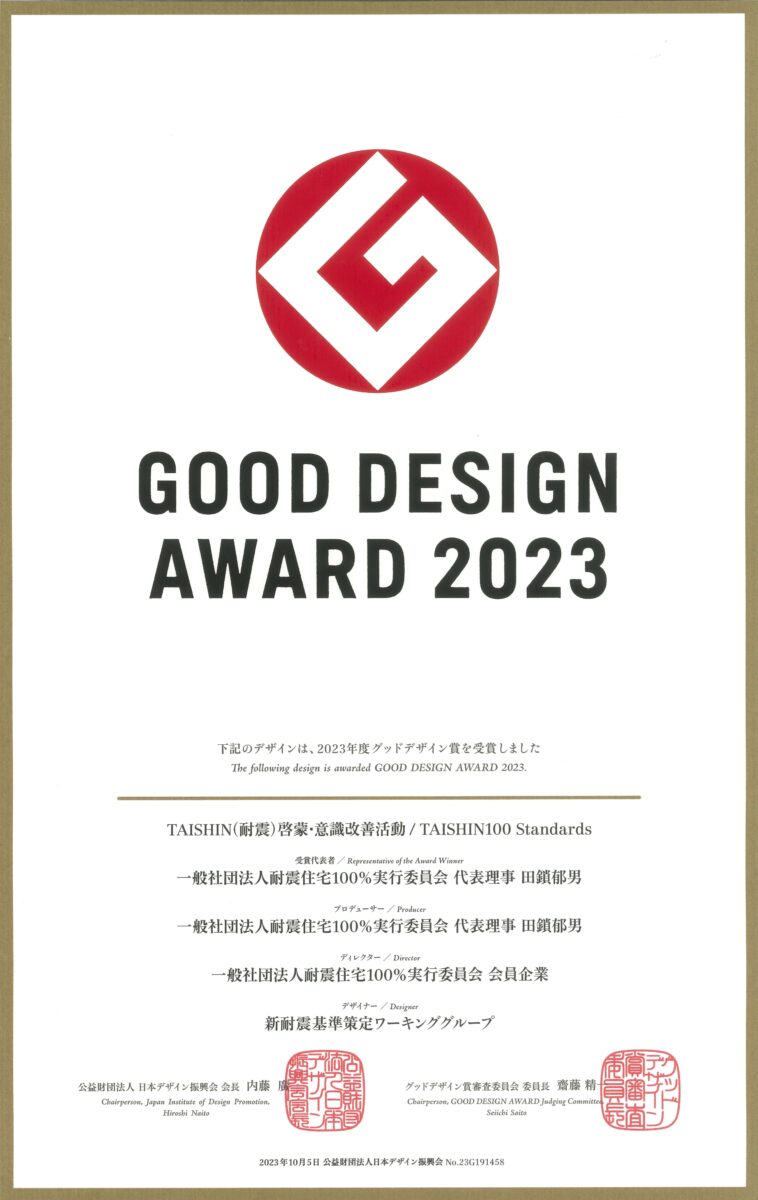 この度、「真の耐震基準」の策定、それに伴う普及啓発活動が評価され、2023年度グッドデザイン賞(主催:公益財団法人日本デザイン振興会)を受賞しました。