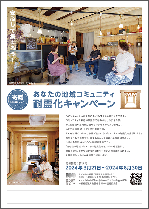 そして、さらなる社会活動の一環として「あなたの地域 コミュニティ耐震化キャンペーン」を開催し、誰でも安心して集まれる公共的な施設や民間の建物に対して、木質耐震シェルターを無償提供する活動を 行っています。