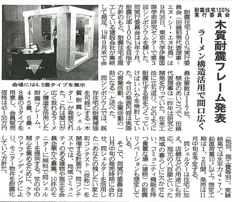 2019年10月8日付の住宅新報にて、9月26日に開催した「第2回社員総会及び第3回シンポジウム」の会場にて展示した木質耐震シェルターの記事が掲載されました。