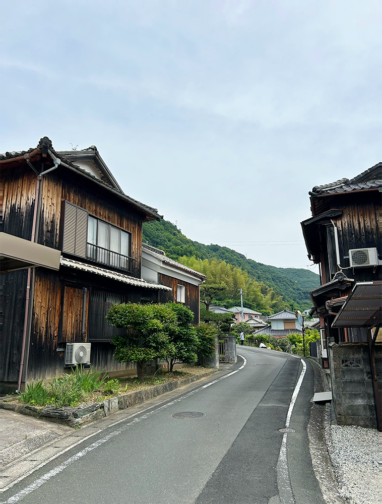 伊⽅町は、広いとはいえない道路に⾯して家が⽴ち並ぶ住集落。平地も少ないため、⼭間に向かうほど道は細くなり、駐⾞場もない家が増えていきます。「この辺りでは、道路があるだけ便利な⽅」と⽑利さんは⾔います。もともと耐震化率の低い⼟地柄である上、⾼齢化率は県で2番⽬となっています。