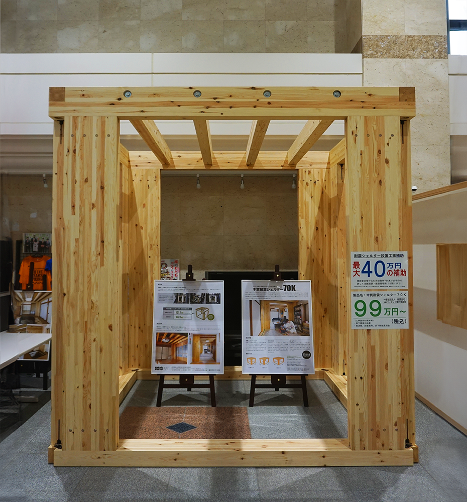結果的に役場1階のホールのスペースを⼤きく使って、3社のシェルターの実物3種類を展⽰することになりました。シェルターのサイズや強靭さが直感的に伝わるこの展⽰は、役場内で反響があったのはもちろんのこと、折々に役場を訪れる町の⽅々の興味を惹くインパクトがあるといいます。なかでも、⽊質耐震シェルター70Kは、空間が開放されていて圧迫感がない。壁がないので、いままでの空間とさほど変わらずに⽣活ができるのではないか、と評価されています。