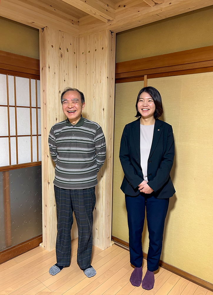 内藤さんによると、2階に寝室があるものの、奥様が足を悪くされており、階段の昇り降りが難しく、やむを得ず1階のリビングで寝起きされているとのこと。また息子さんのことも気にされていて、一刻も早く、お二人が安心して過ごせる家にしたいという想いが強く伝わってきました。「そこで、やっぱり木質耐震シェルター70Kがピッタリ!だと思いました」と篠原さん。