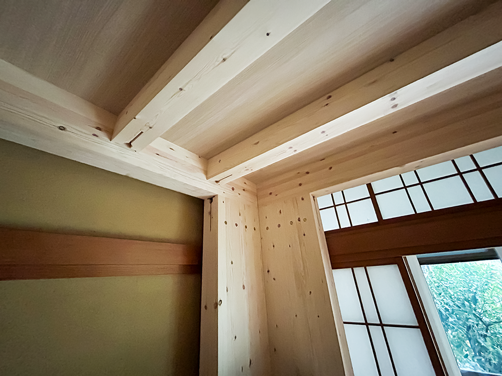 「奥様がこれからここに寝られるのは安心ですよね。ご家族の反応はいかがですか?」と、篠原さん。「いやー、良かったって言ってます。これはもうね、安心感がちがう。幅400の柱同士がコーナーで接しているでしょう。このコーナーは見事だと思うな」。